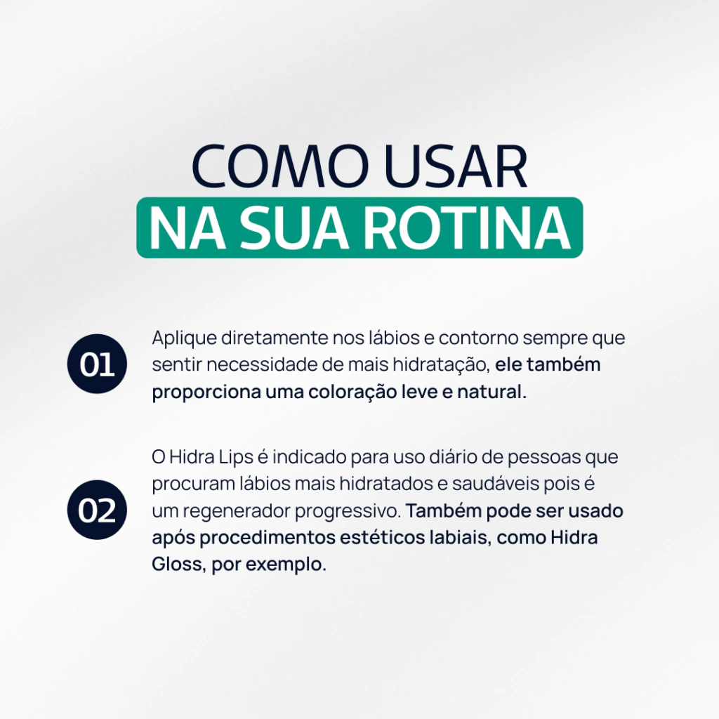 O Hidra Lips é indicado para uso diário de pessoas que procuram lábios mais hidratados e saudáveis pois é um regenerador progressivo. Também pode ser usado após procedimentos estéticos labiais, como Hidra Gloss, por exemplo.