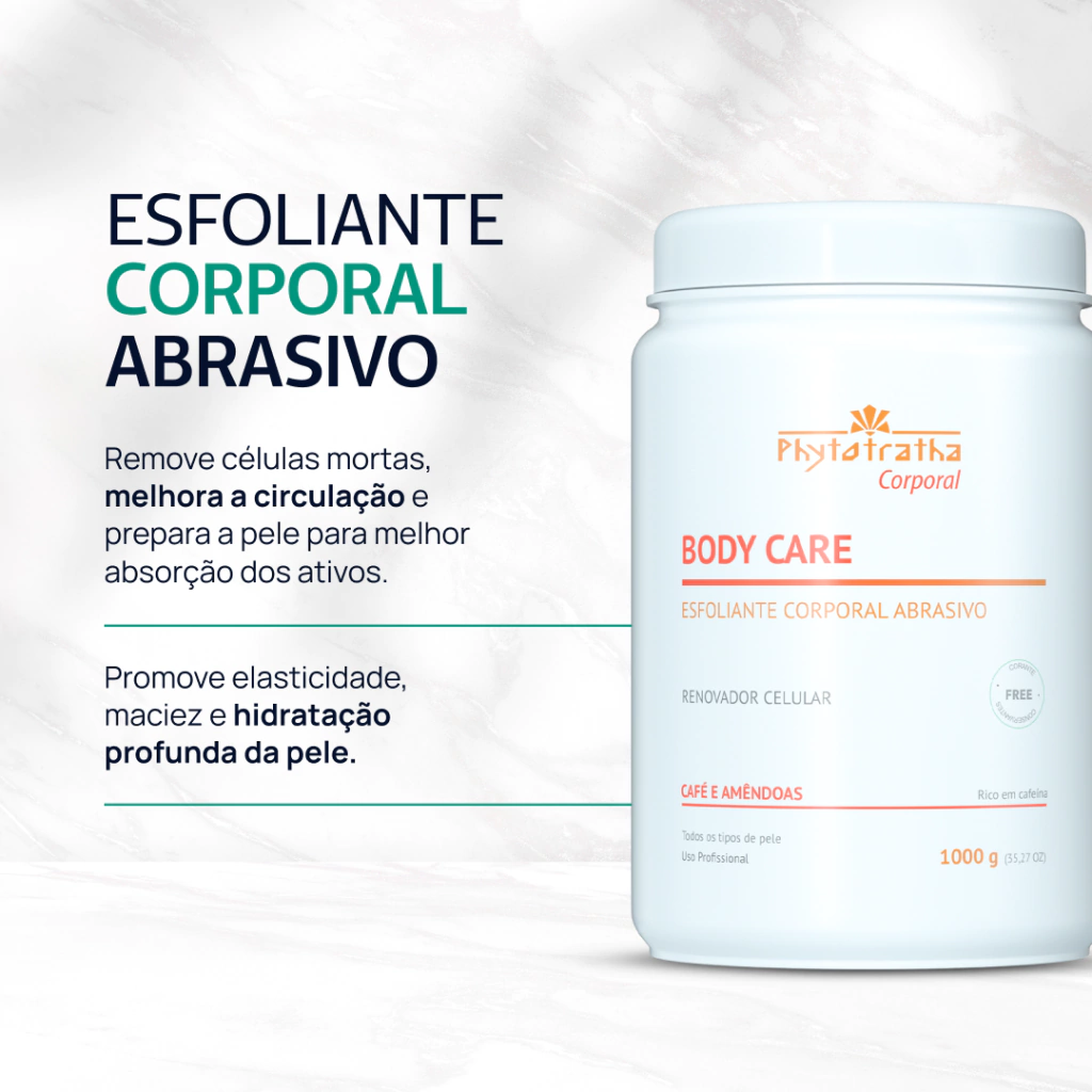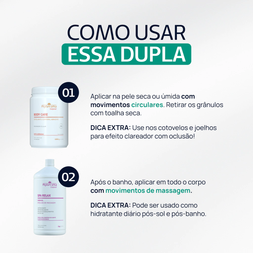 A combinação estratégica do Esfoliante Corporal - Body Care com o Cremoil Relaxante promove uma renovação completa da pele, removendo impurezas, melhorando a textura e repondo a hidratação e os nutrientes necessários para um toque aveludado e uma aparência luminosa.