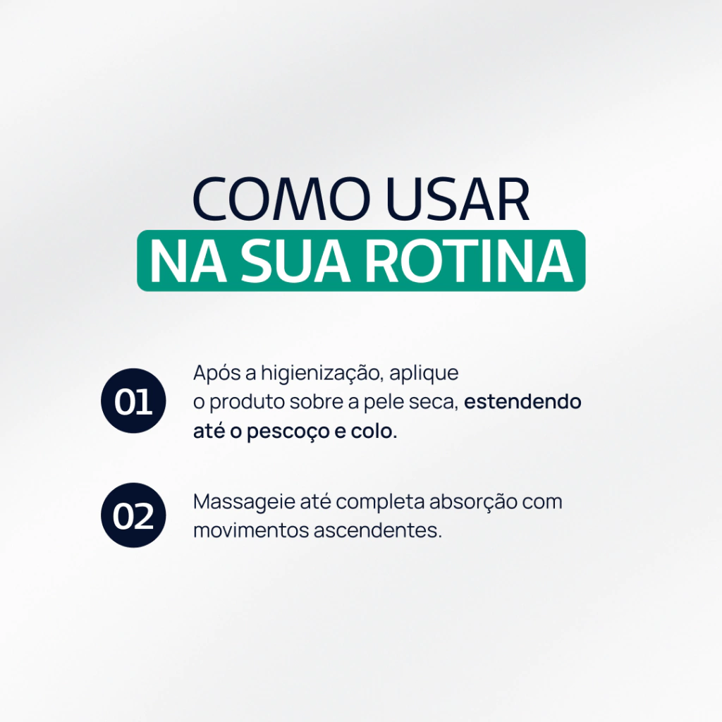 Após a higienização, aplique o produto sobre a pele seca, estendendo até o pescoço e colo.