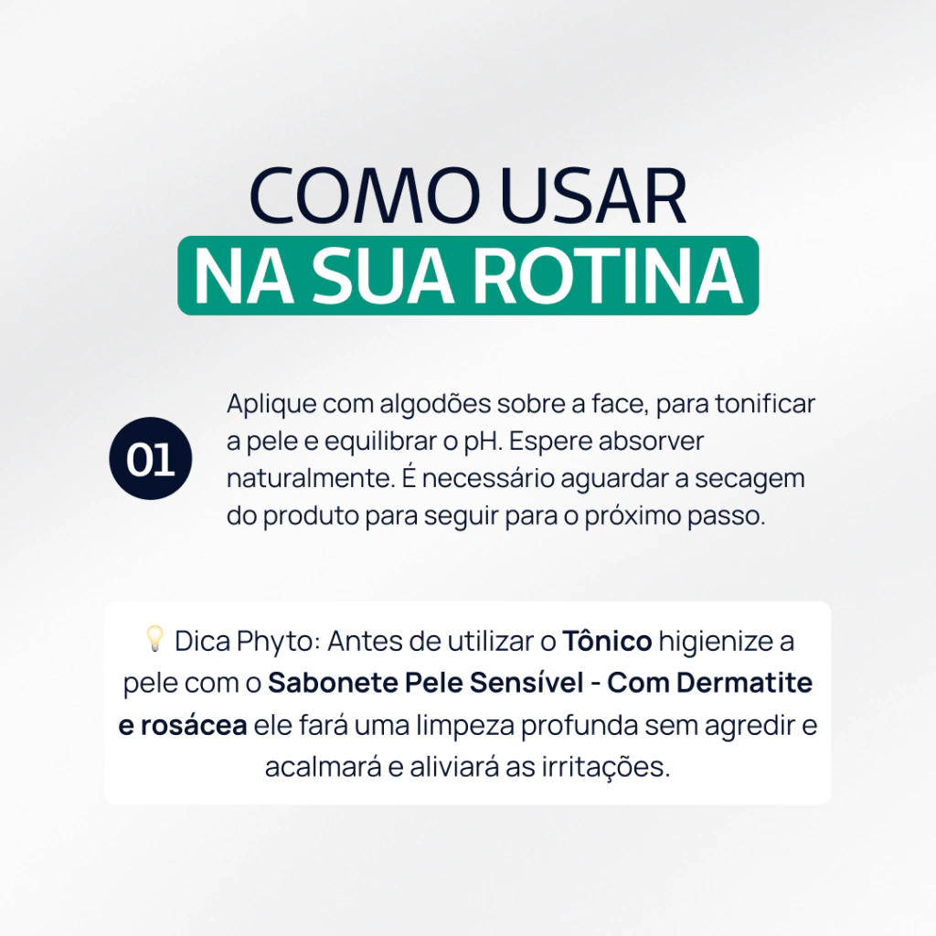 Dica Phyto: Antes de utilizar o Tônico higienize a pele com o Sabonete Pele Sensível - Com Dermatite e rosácea ele fará uma limpeza profunda sem agredir e acalmará e aliviará as irritações.