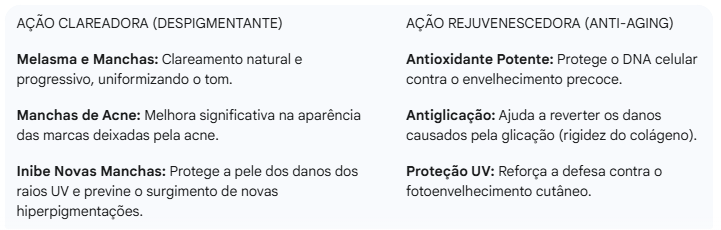Clareador de manchas e melasmas, uniformiza o tom da pele e também funciona como Anti-aging para tratamento de rejuvenescimento.